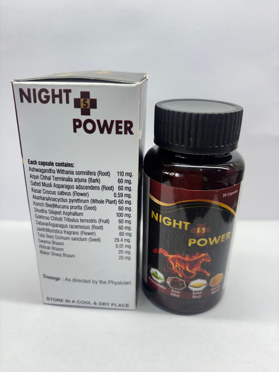 Night S Power Capsules are specially formulated herbal capsules designed to support stamina, vitality, and overall well-being. Made with a blend of traditional Ayurvedic ingredients such as Ashwagandha, Akarkara, Safed Musli, and Swarna Bhasma, this supplement helps maintain energy levels and physical strength.