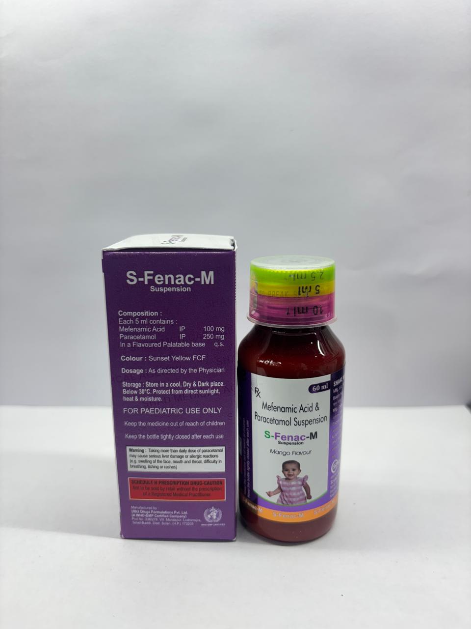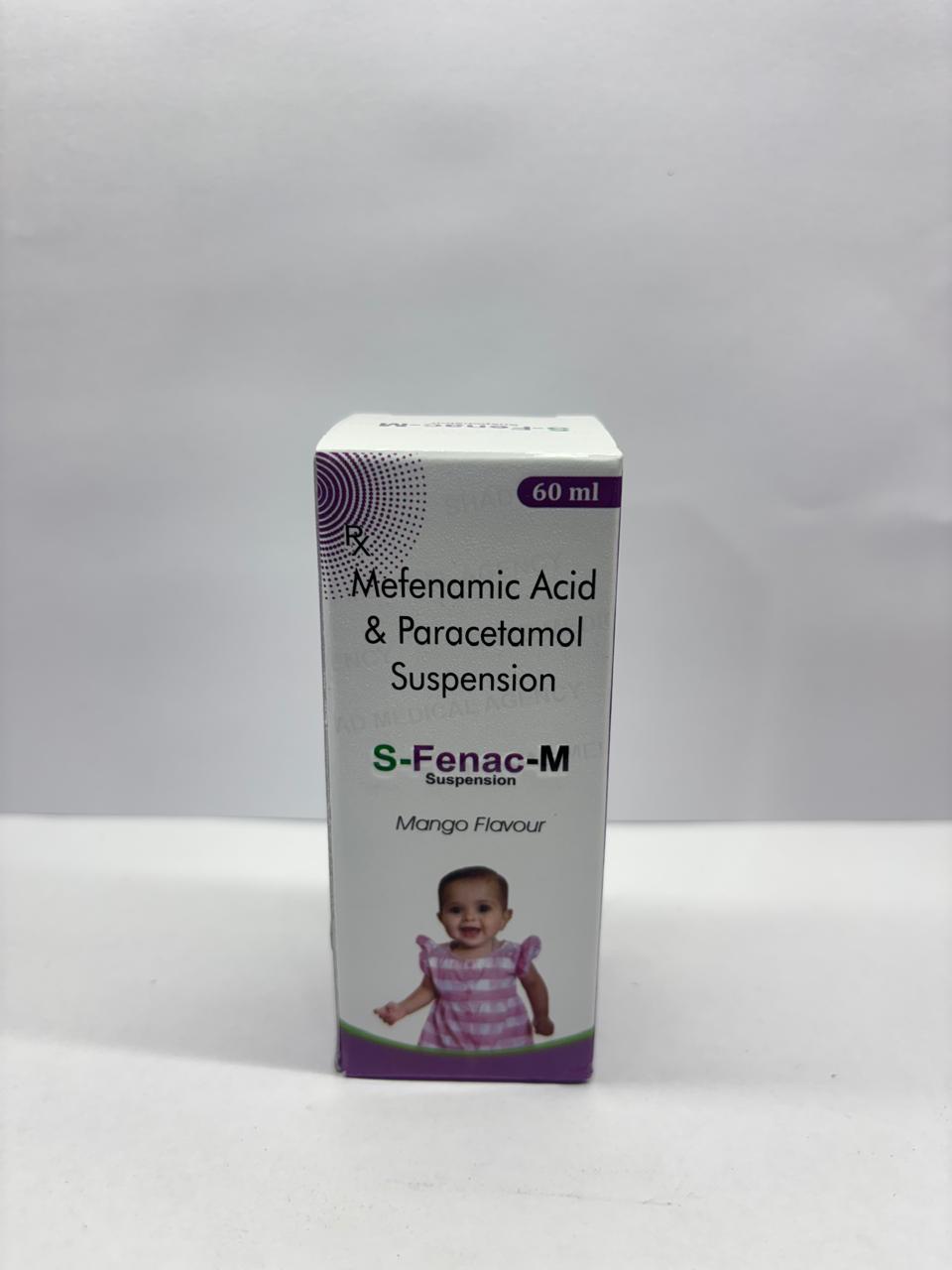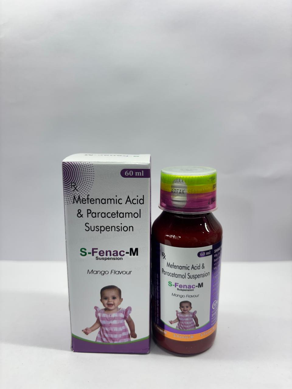 Buy S-Fenac-M Suspension 60ml containing Mefenamic Acid and Paracetamol. Pediatric prescription syrup used for fever and pain relief in children. Mango flavour. Use under medical supervision.