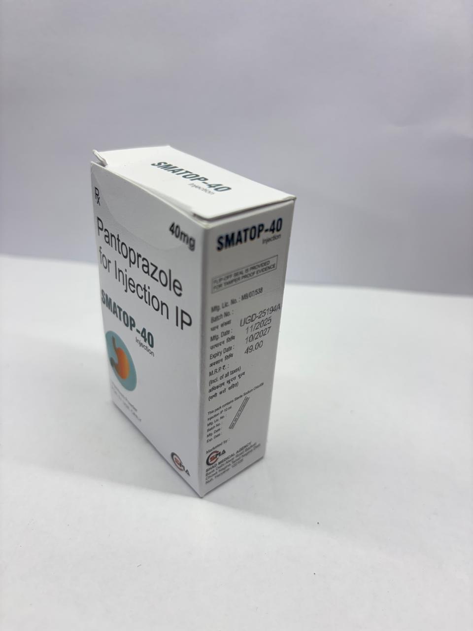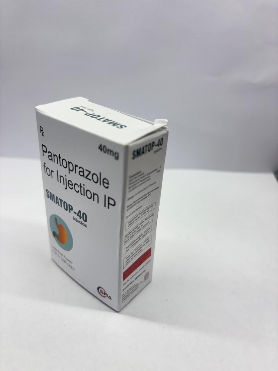 Smatop-40 Injection is a Pantoprazole 40 mg intravenous formulation designed to reduce gastric acid secretion. It is supplied as a lyophilized powder for IV use only.